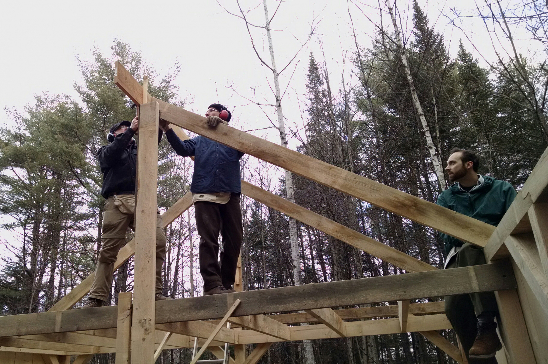 Galen, his dad, and his brother building the family's lakeside cabin.